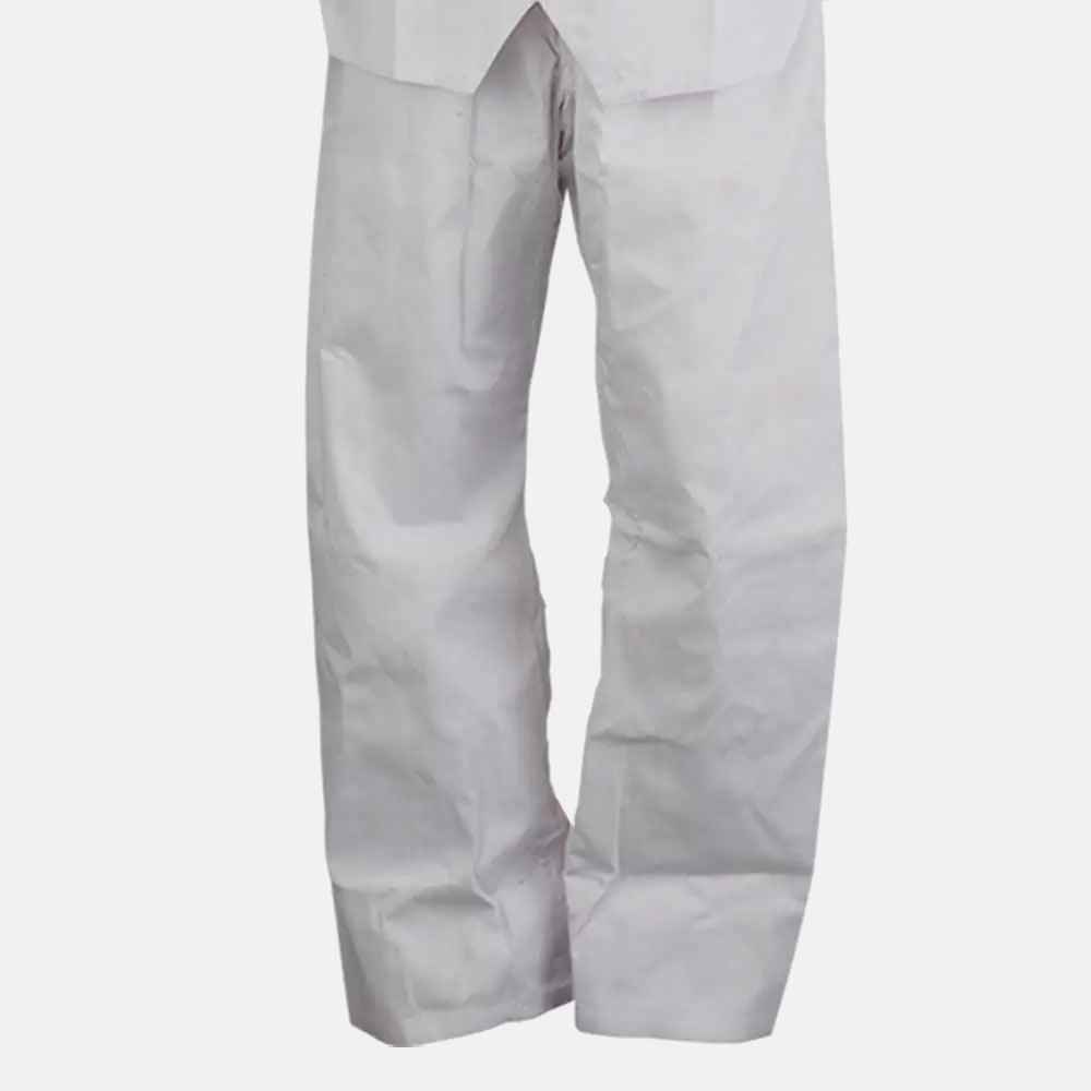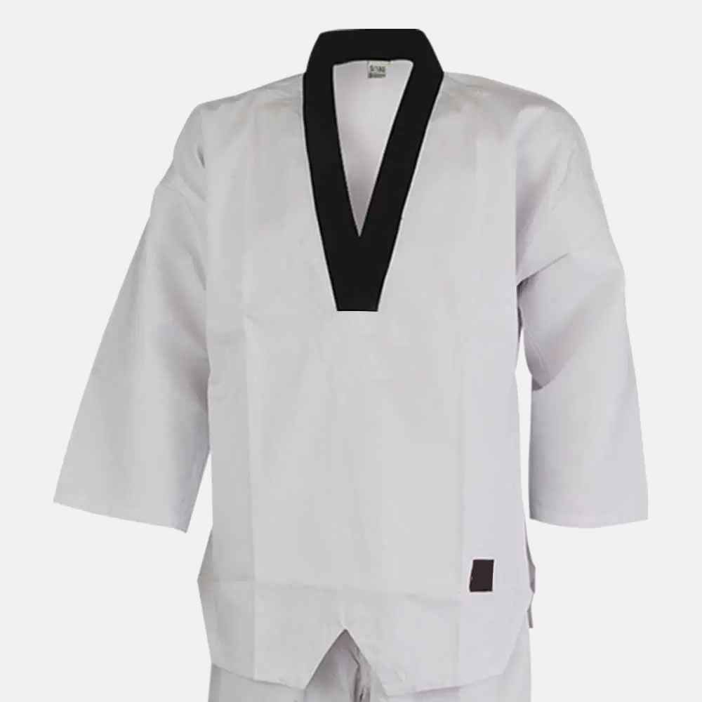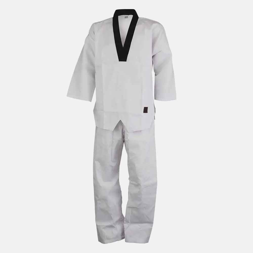 White with Black V Neck “8-oz”. Made from 8-oz white bleached Pants with elastic waist band. With 4cm white belt. Size: 000/110cm to 7/200cm Also available in Ribbed Fabric Also available with white V Neck & in 100% cotton.